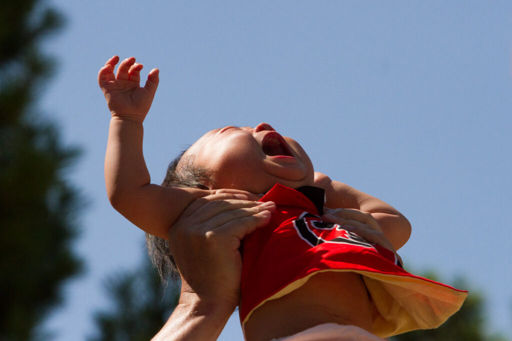In each match, two babies face off. First, parents hand over their babies to the sumo wrestlers, who carry the children into the dohyo. The wrestlers then hold the pair of dueling children while facing each other in the center of the dohyo. When the gyoji gives the command with a swish of his fan, the children are quickly hoisted into the air. This unexpected action is meant to make their baby cry before its opponent. If the babies are unmoved by this effort after four seconds – or worse yet, find the whole thing amusing or fall asleep – the gyoji will intervene and attempt to coax them into a state of distress without being completely cruel.