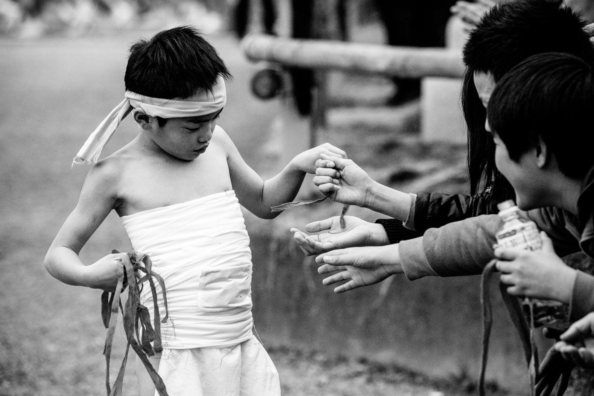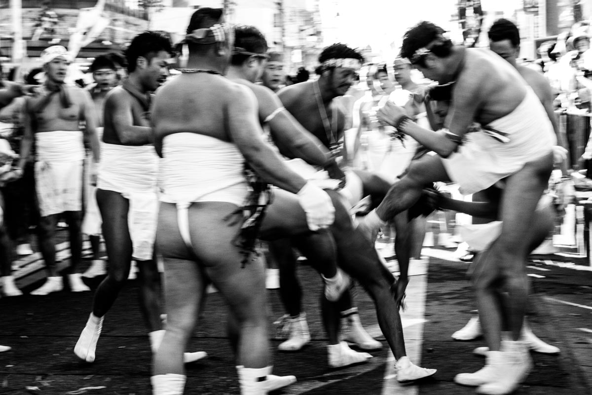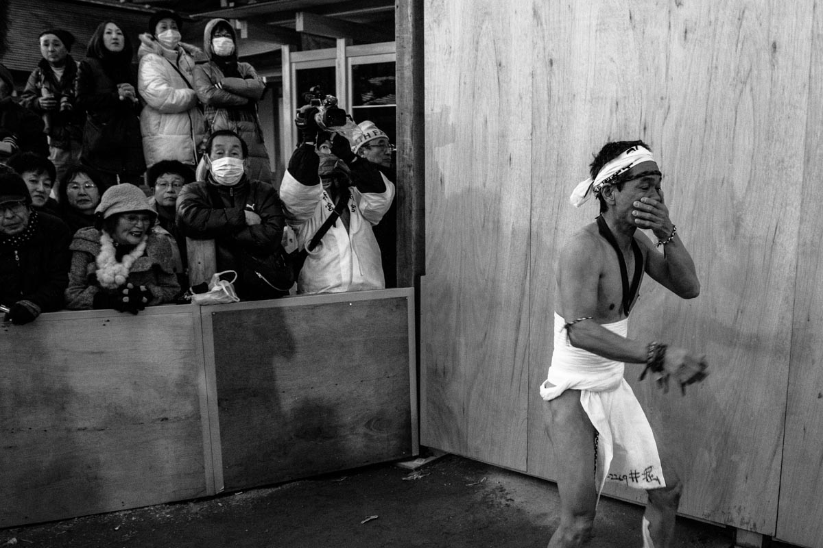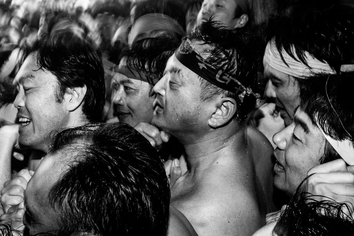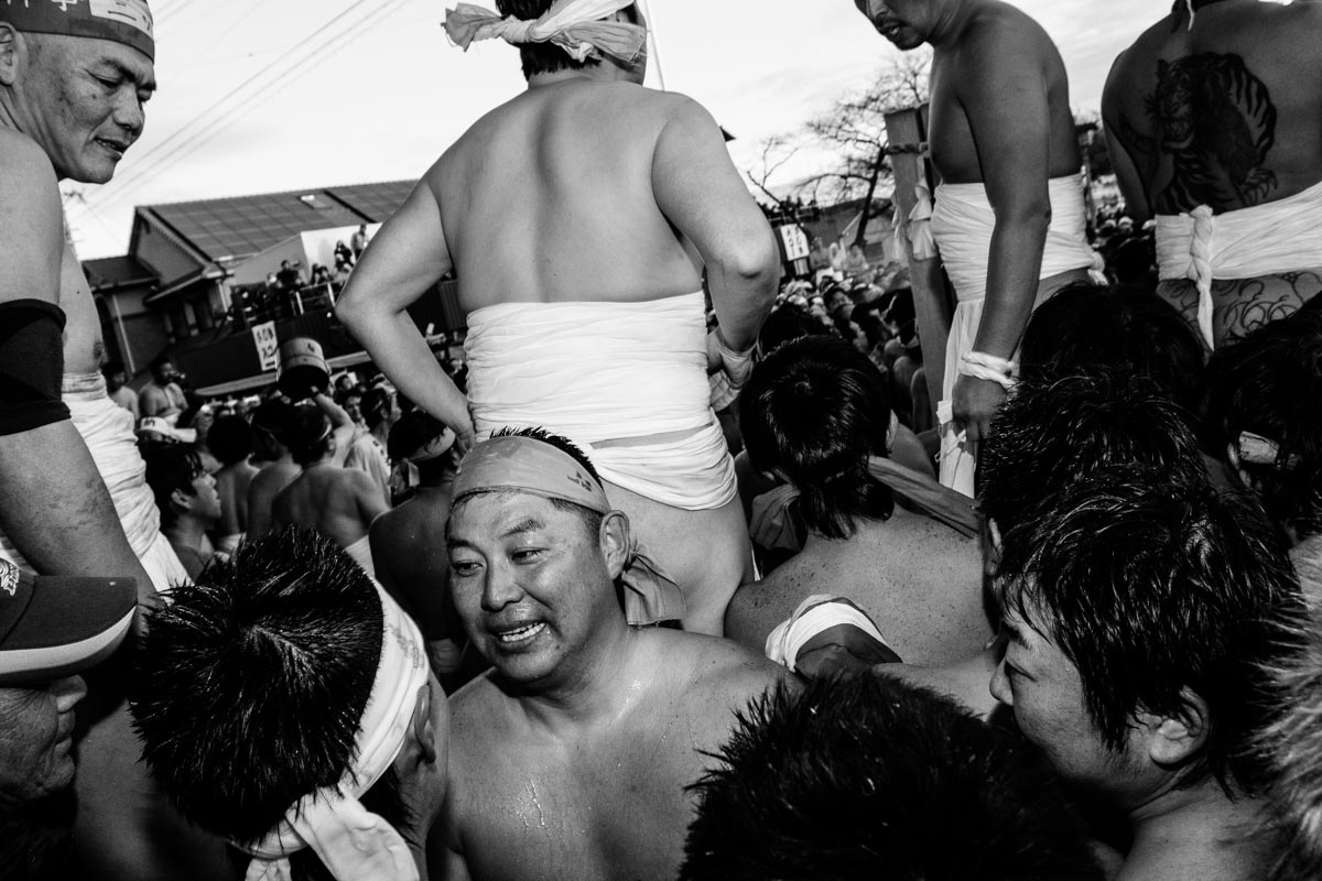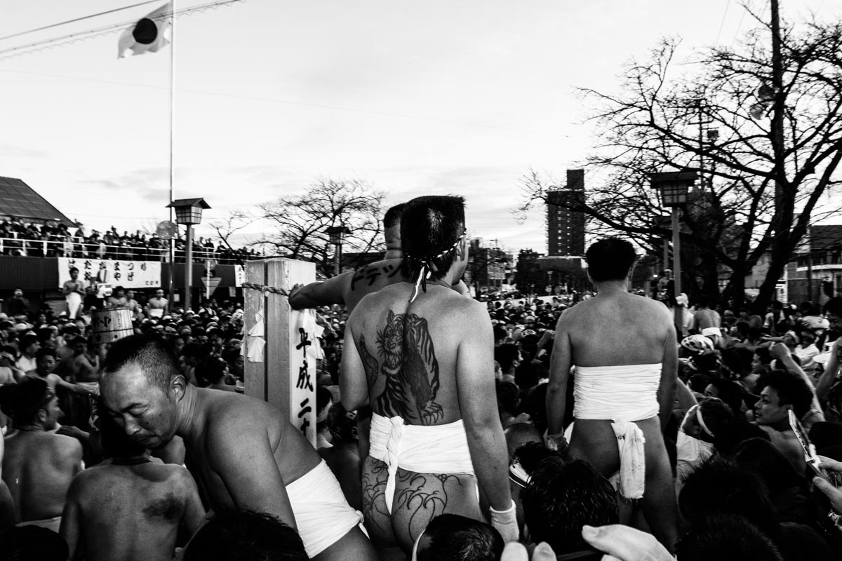 Charged with what felt like an inexhaustible amount of sake, the stench of sweat and the roar of the crowd, who scrambled to grab bits of my headband and armbands, which are supposed to bring good luck, the sense of unease and apprehension I felt at being virtually naked, bitterly cold and one of the only foreigners involved in the festivities soon dissipated. Despite my newly inflated confidence I couldn’t help noticing that amongst my mixed (but entirely male) bunch of comrades, formed mostly of run-of-the-mill businessmen, software developers, mechanics, and engineers, a number of slightly less savoury-looking characters were also taking part in the day’s events, emblazoned with large and intricate tattoos suggestive of ties to the yakuza (Japanese mafia). At times, sweat and blood streamed from the stampeding horde as it charged forwards, the object of its desire being to touch the shin-otoko. Many men participate during their yakudoshi (unlucky) years of 25, 42, and 61, hence their eagerness to come into contact with this “chosen one”, who is said to dispel bad omens and ward off evil.