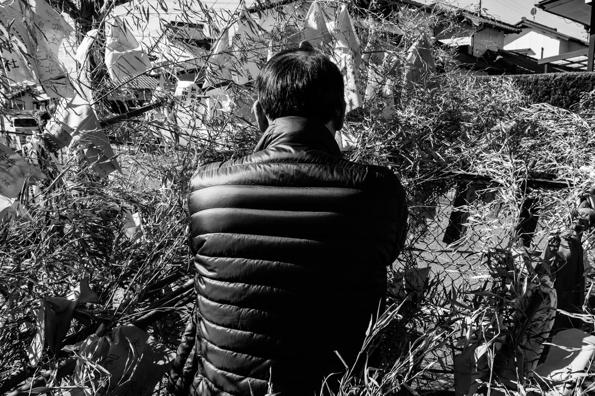 Being British, and therefore sympathetic to Inazawa’s history of plague, bad luck and terrible weather, I decided to experience the festival for myself by joining a team of men from a nearby community. Our first stop was a local nursing home, owned by one of the participants, where we bathed and cleaned ourselves in preparation for the day ahead. Next was a local primary school, where a breakfast of sushi, karaage (fried chicken), sake and beer was served. Once we had enough alcohol in our bellies to make us feel less self-conscious about the daunting task ahead, it was time to strip down completely, before being man-handled into an eye-wateringly tight loincloth (known as a fundoshi), which offered little in the way of warmth and even less in the way of dignity. But, spurred on by fear, testosterone, the onset of drunkenness and the pride felt in helping to carry the naoi-zasa, I began the march towards Konomiya Shrine with my new brothers-in-arms.1A naoi-zasa is a collection of long bamboo poles tightly held together with cloth. The names, birthdays and wishes of those who cannot participate in the festival, such as women, children or sick men, are written on small pieces of cloth called naoi-gire and placed inside the naoi-zasa.